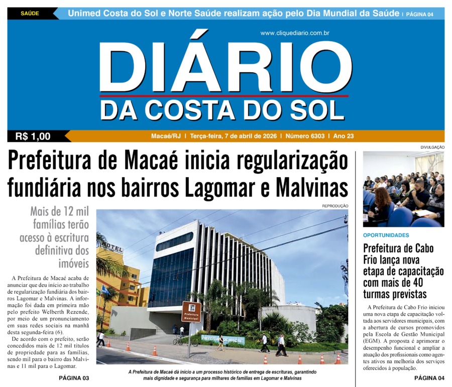 Sem categoria Edição de terça-feira 07/04/2026 nº 6303 Publicado em 07/04/2026 - 09:35 Escrito por Redação Notícias relacionadas: Anterior Macaé intensifica fiscalização contra pesca predatória na Lagoa de Imboassica Redação Notícias Recentes Cultura30 minutos atrás Exposição de artistas com TEA tem presença da prefeita em Silva Jardim Cultura51 minutos atrás Rio das Ostras levará artistas locais para a Feira Rio Artes, no Rio, em abril Educação1 hora atrás Rio das Ostras comemora marca histórica de alfabetização na rede municipal Cidades1 hora atrás Dois homens morrem em grave acidente entre carros na região de Travessão, em Campos Cidades2 horas atrás Macaé irá promover projeto de inclusão com segunda edição do Walking Tour Polícia2 horas atrás Homem com passagem na polícia por tortura e outros crimes é preso por tráfico em Macaé Sem categoria3 horas atrás Edição de terça-feira 07/04/2026 nº 6303 Arraial do cabo19 horas atrás Inscrições são abertas para participação em projetos ambientais da Funtec em Arraial do Cabo Saúde19 horas atrás Saquarema anuncia implantação de método contraceptivo gratuito na rede de Saúde Arraial do cabo19 horas atrás Ação da Ronda Escolar transforma aniversário em momento de acolhimento e cidadania em Arraial do Cabo Clique Diário E. L. Mídia Editora Ltda CNPJ: 09.298.880/0001-07 Redação: Rua Tupinambás 122 Gloria – Macaé/RJ comercial@diariocs.com (22) 2765-7353 (22) 999253130 Mais lidas da semana Edições Impressas6 dias atrás Edição de quarta-feira 01/04/2026 nº 6300 Cidades6 dias atrás Macaé inaugura Clínica da Mulher e amplia atendimento à saúde feminina Cidades5 dias atrás Finalista do Jabuti, Thais Pessanha apresenta novo livro sobre inclusão Sem categoria5 dias atrás Mulher é presa em Campos após esfaquear o próprio marido